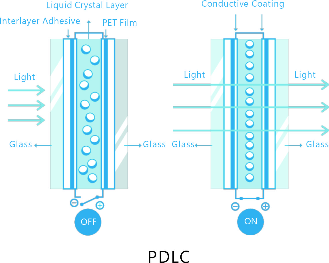 PDLC film in the absence of an electric field, the electronically controlled smart film is in an opaque state.