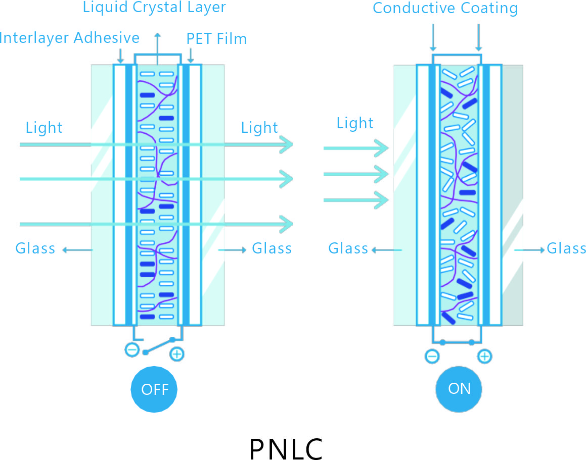 PNLC film different from normal PDLC smart film,the working principle of PNLC film is opaque-power on,clear power off.